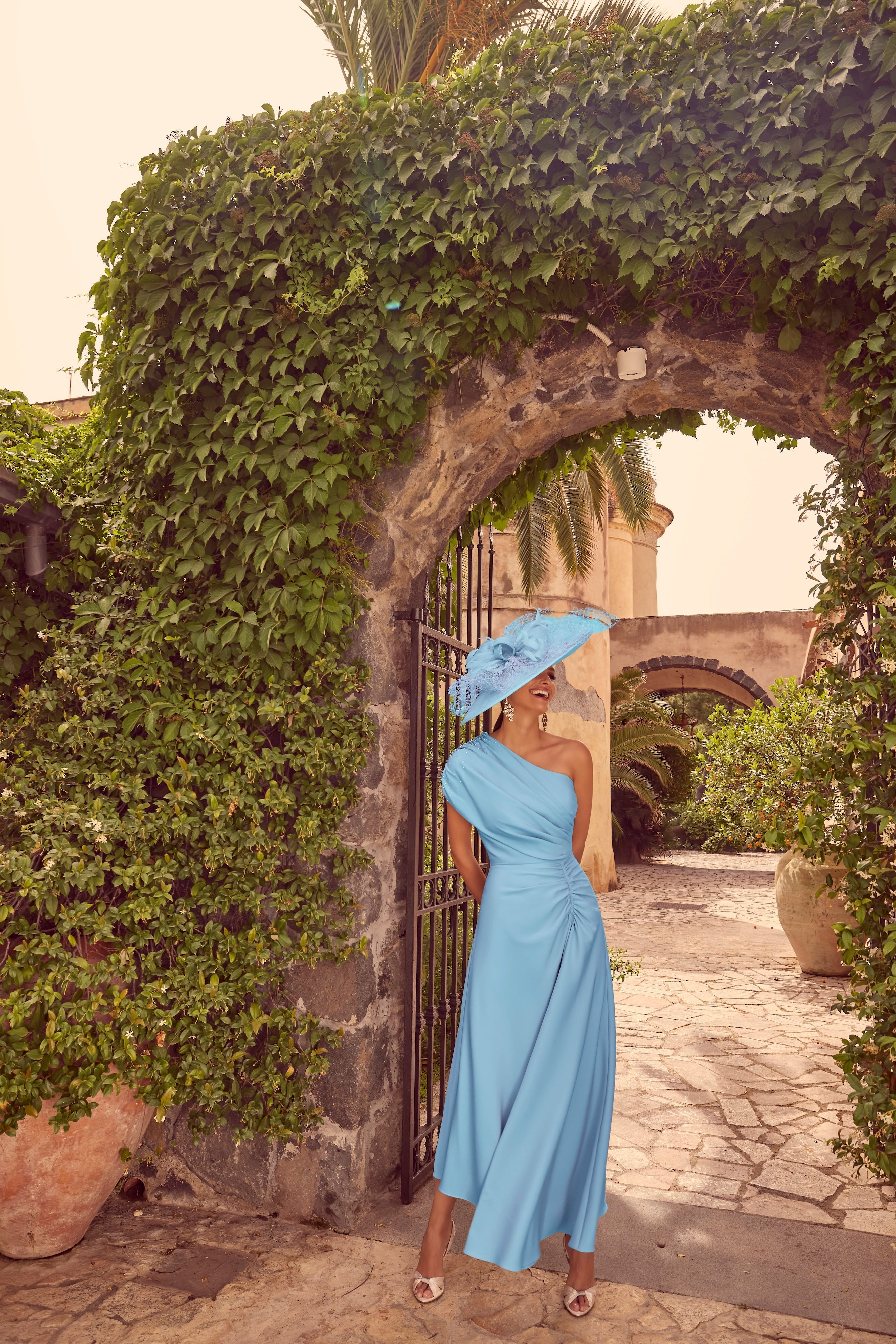 Indulge in luxury with Invitations by Veni 36114 Pale Blue. This one shoulder elegant dress features soft draping for a special and sophisticated look. Perfect for those who desire a tasteful and refined ensemble without too much detail. Elevate your style with this exclusive piece.