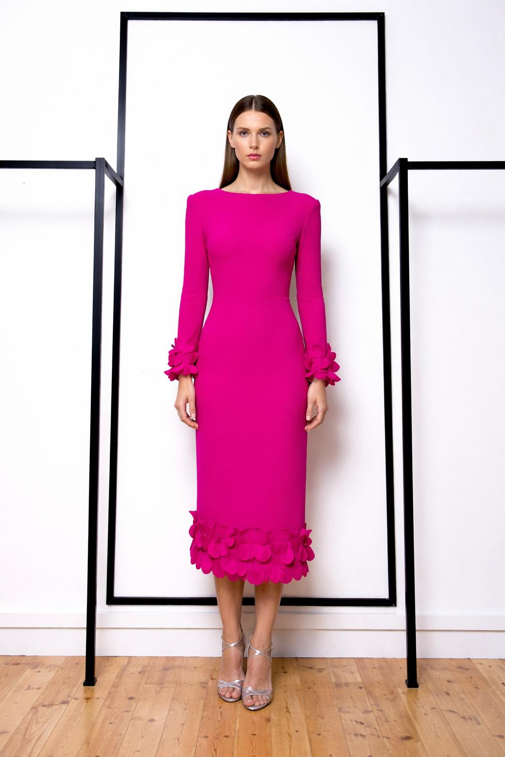 Indulge in elegance with the Fely Campo 24013 Fuchsia dress. The midi length and 3D petal appliqués add dimension and a modern twist to this classic piece. Perfect for any special occasion, this dress will have you standing out with its unique and sophisticated design. Ideal for mothers of the bride or groom.