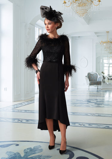 Step into elegance and sophistication with our Irresistible IR7726TJ Black dress. The dipped hem and feather details add a touch of luxury, making it perfect for a black tie wedding or a day at the races. Elevate your style and turn heads with this irresistible piece.