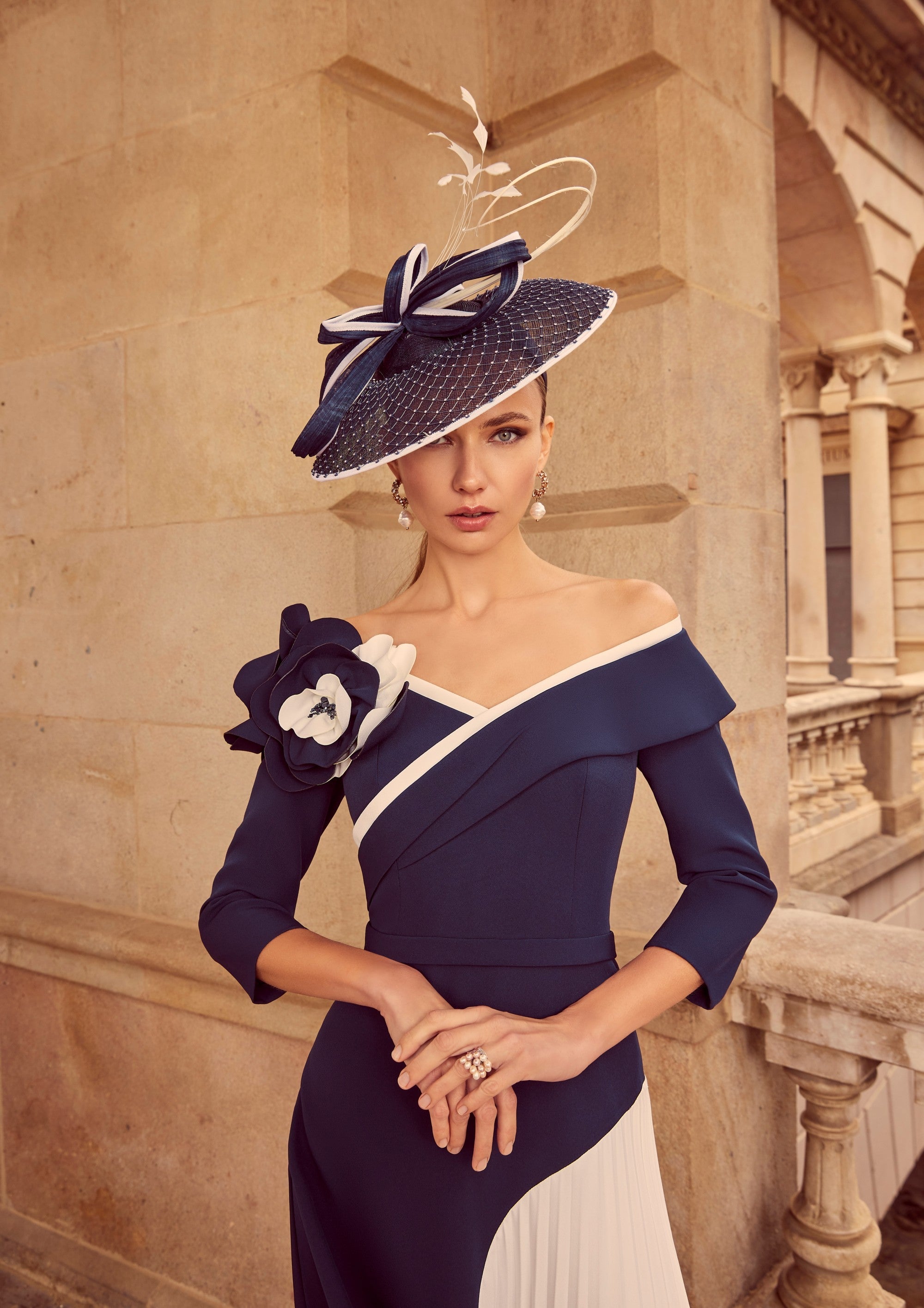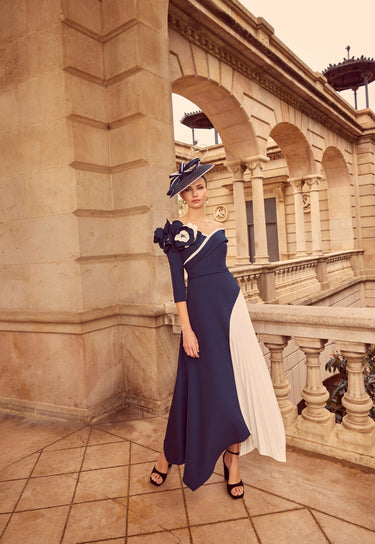 This Veni Infantino 992502A dress combines classic elegance with modern design, ideal for the mother of the bride or groom. Crafted in high-quality crepe, it features an off-the-shoulder neckline and sophisticated 3/4 sleeves. The striking A-line silhouette is enhanced by an asymmetrical pleated skirt adorned with delicate 3D floral motifs, creating a refined and flattering look perfect for special occasions. Available in a graceful navy and ivory colour palette, this dress offers both comfort and style for an unforgettable event.