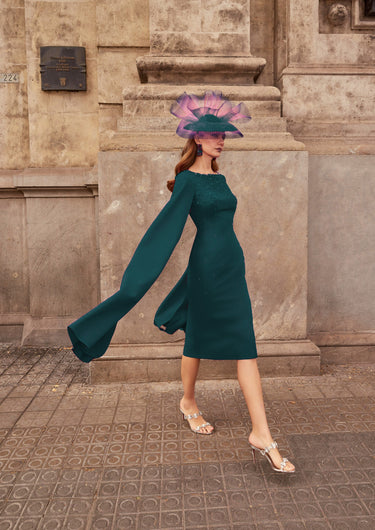 This exquisite Veni Infantino 992509S dress features a refined bateau neckline and a beautifully beaded bodice, perfectly tailored for formal occasions such as mother of the bride or groom events and black-tie affairs. Crafted from luxurious crepe, it offers a flattering silhouette enhanced by elegant full-length cape sleeves, combining sophistication with contemporary design for a commanding presence.