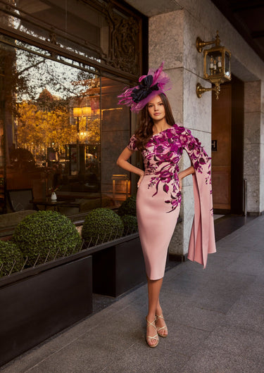 This Veni Infantino 992527 dress in rose and wine tones features a modern asymmetrical design with a striking one-shoulder cape sleeve. Its mid-length cut is elegantly enhanced by delicate 3D floral petals, making it an ideal choice for the mother of the bride or groom seeking a sophisticated and distinctive look.