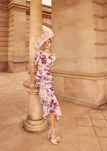 This elegant Veni Infantino dress features a modern high-low ruffle hem and a distinctive asymmetrical neckline, complemented by graceful half cape sleeves. Crafted from lightweight chiffon, it offers a refined silhouette perfect for mother of the bride or groom or a guest at a destination wedding. The blend of ivory, berry, and blush hues enhances its sophisticated appeal, ensuring you stand out with timeless style and comfort.