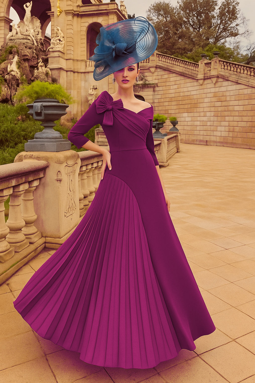 This Veni Infantino 992554 Berry Dress combines contemporary design with elegant detailing, perfect for the mother of the bride or groom. Its flattering A-line silhouette features a contrasting pleated section that flows seamlessly into a straight skirt, enhancing movement and grace. The wide V-neckline and ¾ length sleeves offer a sophisticated frame, while the delicate pleated bow on one shoulder adds a refined, stylish touch. Crafted from crepe fabric, this dress ensures comfort and a polished appearance for any special occasion.