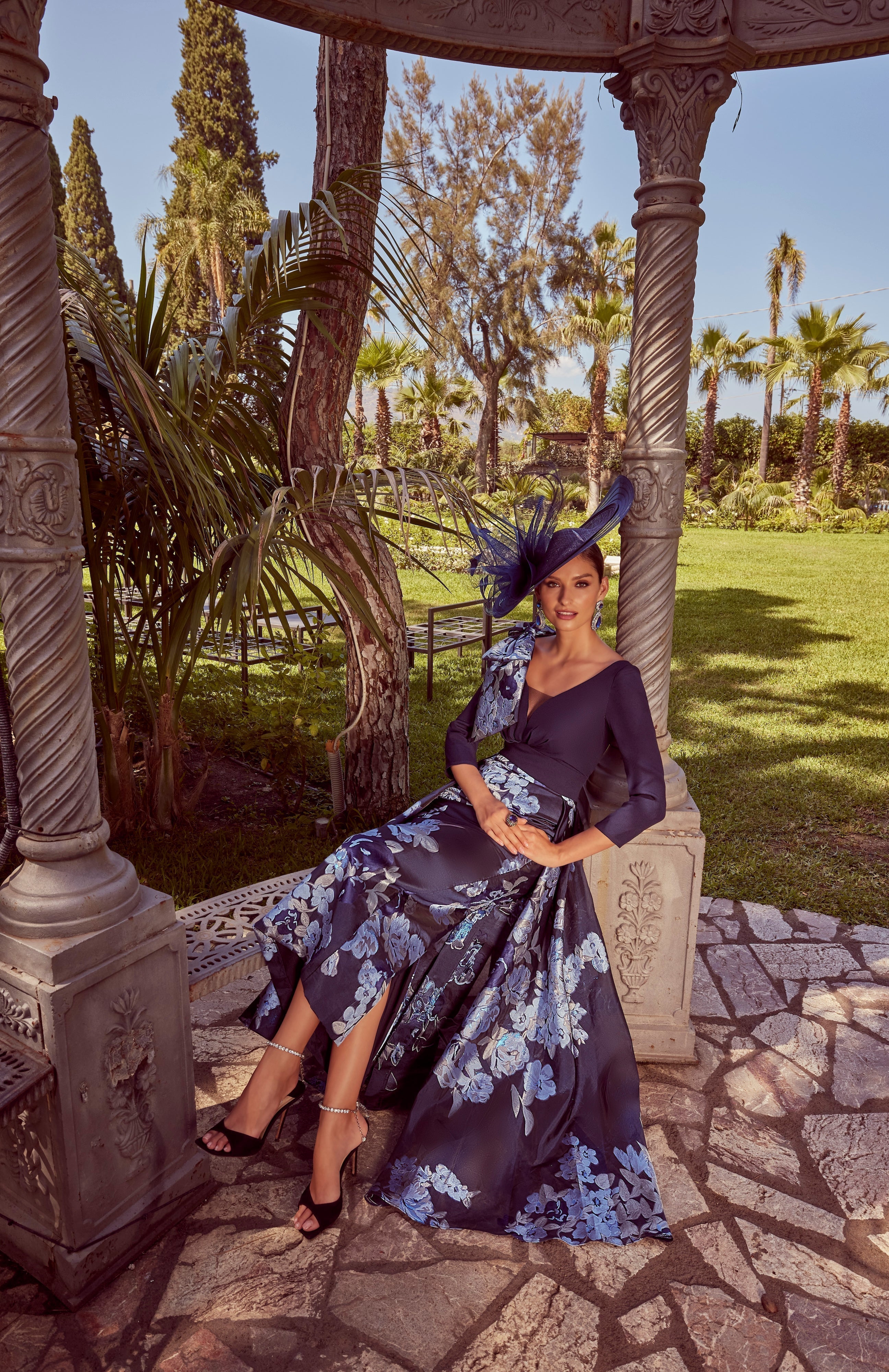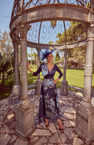 Make a statement in Veni Infantino's 992429 navy and silver print midi dress. The v-neckline and overskirt add unique touches to this occasion dress, making it a truly special piece. Elevate your style with this sophisticated and exclusive design.