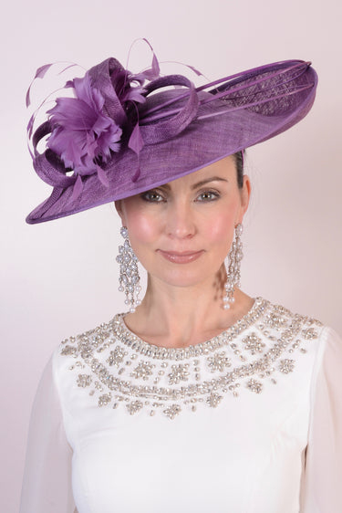 Nigel Rayment's Hatinator in Style 39 showcases a timeless design with a striking trim. The elegant brim features a feather flower and quill embellishment. Dimensions include 42cm side to side and 36cm front to back measurements.