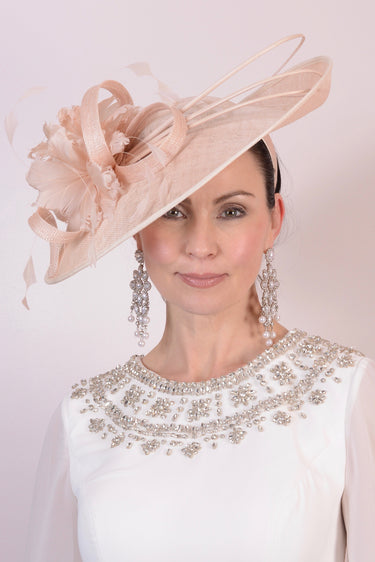 Nigel Rayment's Hatinator in Style 39 showcases a timeless design with a striking trim. The elegant brim features a feather flower and quill embellishment. Dimensions include 42cm side to side and 36cm front to back measurements.