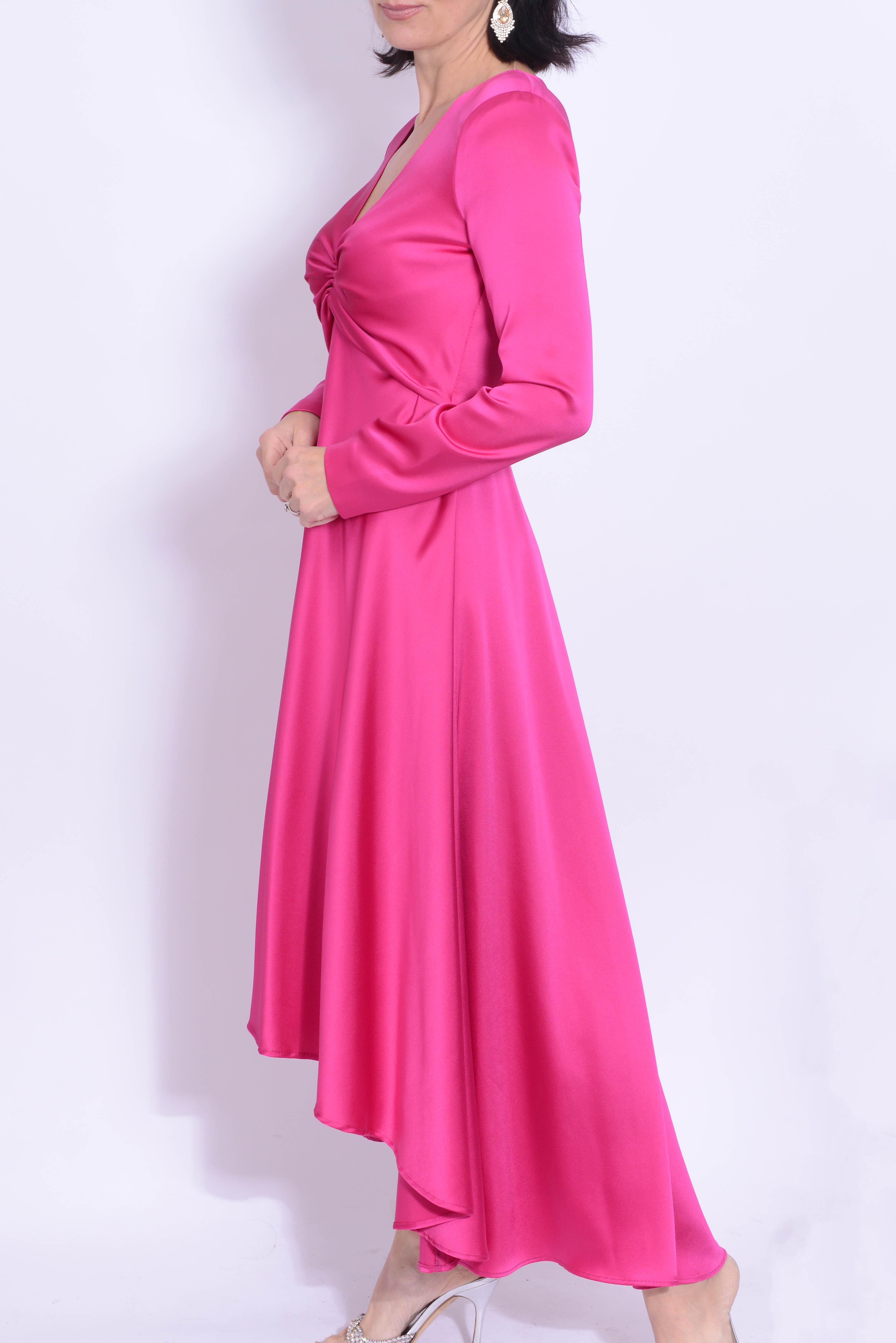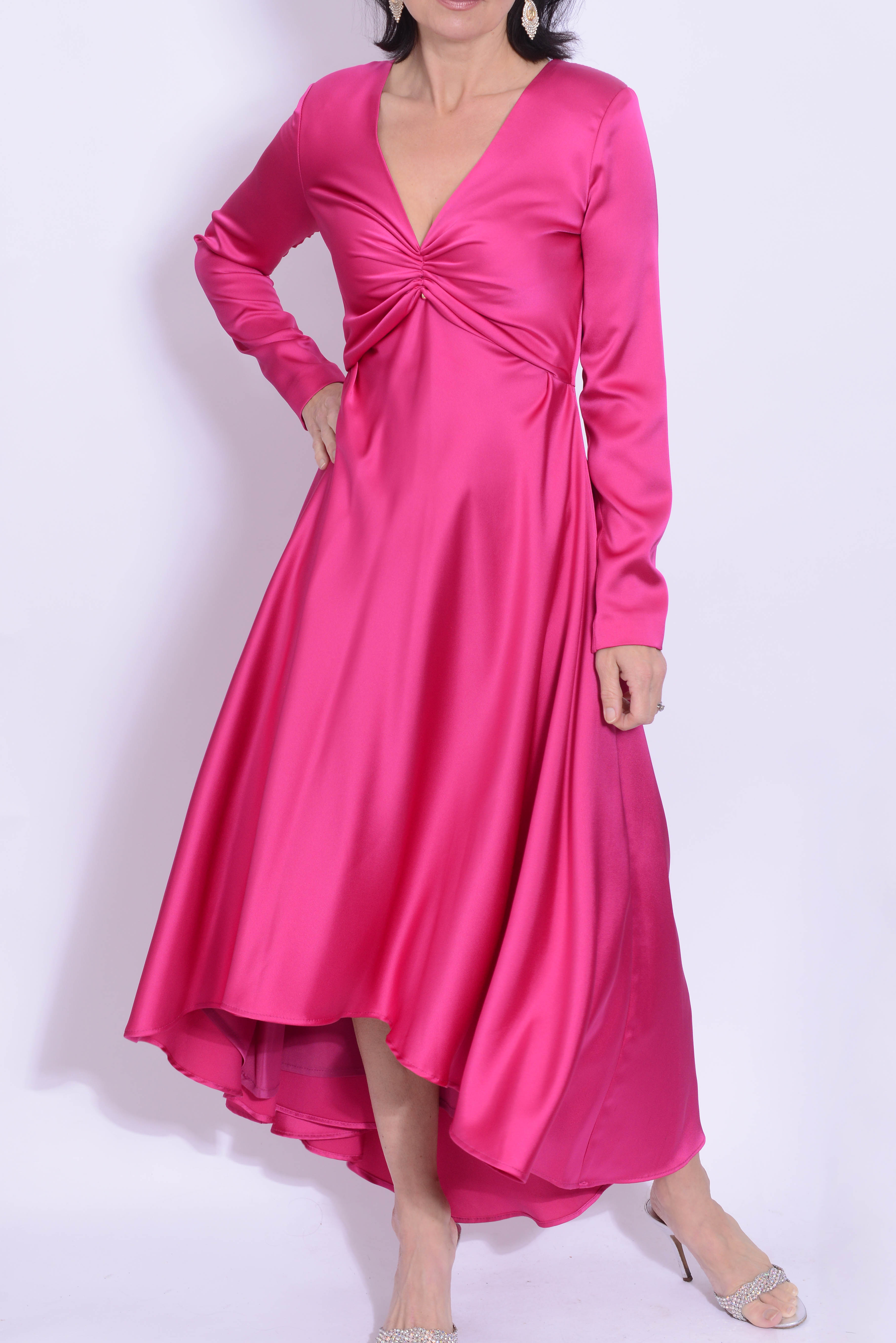 Elevate your style with the Carla Ruiz 98571 Fuchsia dress. Featuring a v neck and dipped hem design, this dress offers a flattering look with a touch of sophistication. Perfect for any occasion, its modern and elegant design will make you stand out. Perfect for the mother of the bride or groom.