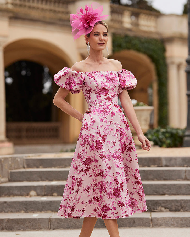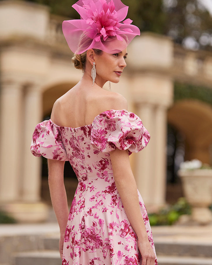 Stand out in a crowd and dazzle onlookers with this Couture Club 8G1H7 Pink, featuring a unique off shoulder style with delicate puff sleeves and a gorgeous brocade. Create a memorable impression with this timeless piece!