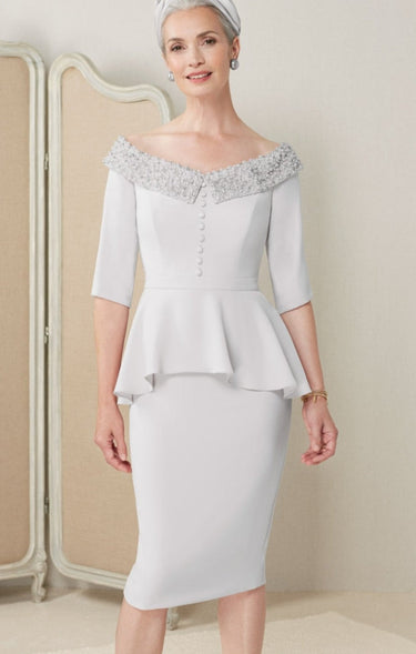 The John Charles 27058 Dress is a vintage-inspired masterpiece that exudes timeless elegance. Featuring a pearl beaded neckline, this dress adds a luxurious touch of sophistication and sparkle. The flattering peplum detail enhances your waist, creating a graceful and feminine silhouette. Faux buttons on the top bodice provide charming vintage appeal, while the overall design combines classic style with modern refinement. Perfect for the mother of the bride or any formal occasion, this dress ensures you make a confident and memorable impression with its exquisite craftsmanship and elegant details.