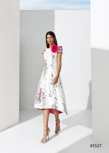 Discover effortless elegance with the Gabriela Sanchez 5527 Fuchsia Floral dress. This stunning floral dress features a unique dipped hem design and an alluring off shoulder neckline for a feminine touch. Make a statement at your next event with this eye-catching dress.