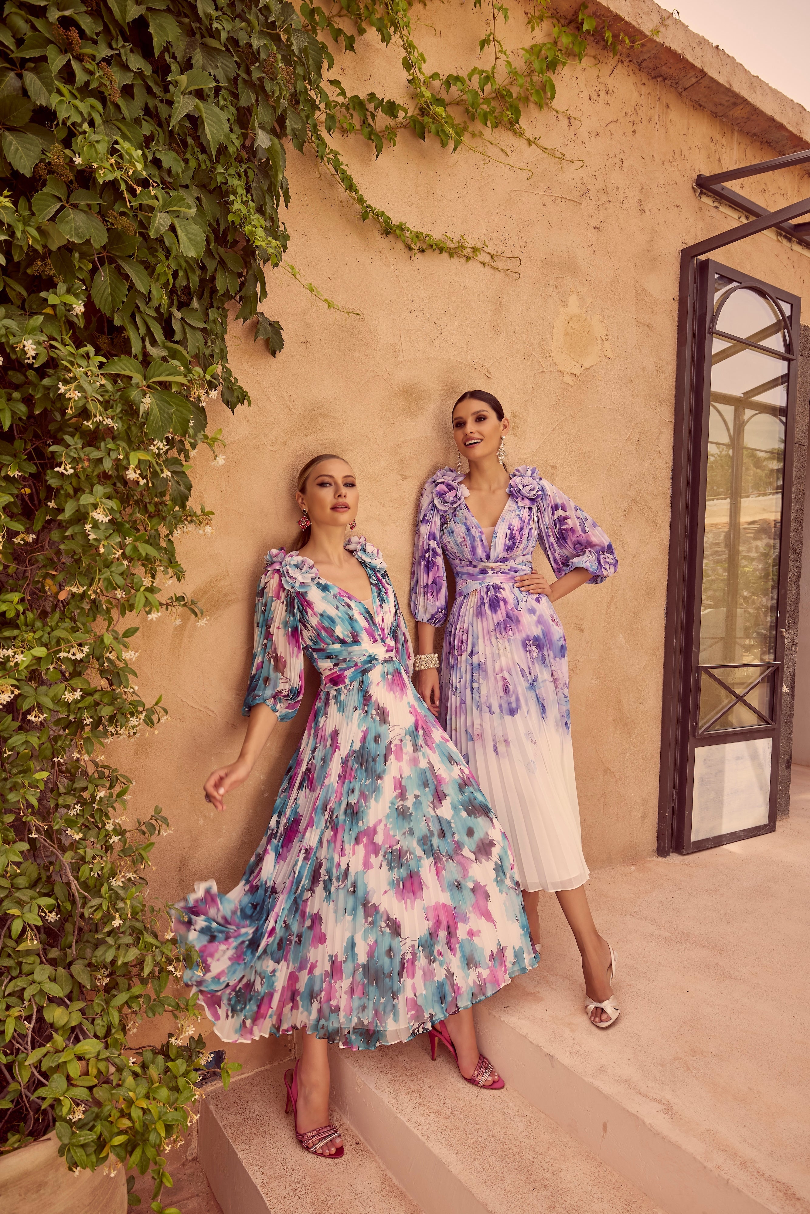 Elevate your style with the Invitations by Veni 36101 Fuxia Turquesa dress. This stunning piece features a soft, delicate color combination, a plunging neckline, and elegant balloon sleeves. Perfect for weddings, this dress can also be worn for other occasions, making it a versatile and timeless addition to your wardrobe. Experience sophistication and luxury with every wear.
