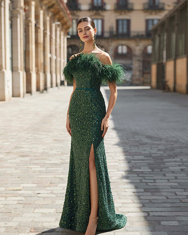Indulge in luxury with the Martha Blanc 9V09 Juniper Green. From its expert craftsmanship to its elegant full length design, this gown will make you feel like royalty. Adorned with stunning beadwork, feathered edging, and a front split, it is perfect for special occasions. Make a statement and wow the crowd in this exclusive gown, ideal for black tie events and weddings.