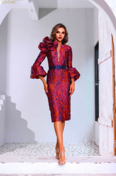 Elevate your evening look with the TERANI COUTURE 251C4167 CLAY cocktail dress. This bodycon silhouette in premium Lava Jacquard hugs your curves beautifully, while the classic V-neckline and 3/4 sleeves add a touch of sophistication. The knee-high back slit and back zip closure make this dress both alluring and comfortable, perfect for any formal event.