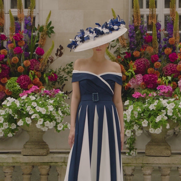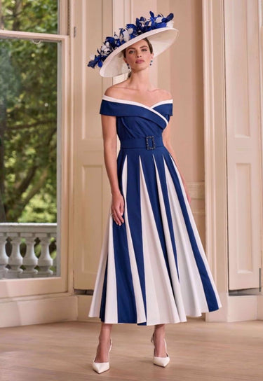 This John Charles 29204 dress features a sophisticated navy and ivory crepe fabric with delicate beading, designed in an elegant A-line silhouette. The bardot neckline and contrast panel add refined detail, making it an ideal choice for the mother of the bride or groom seeking timeless style and graceful comfort.