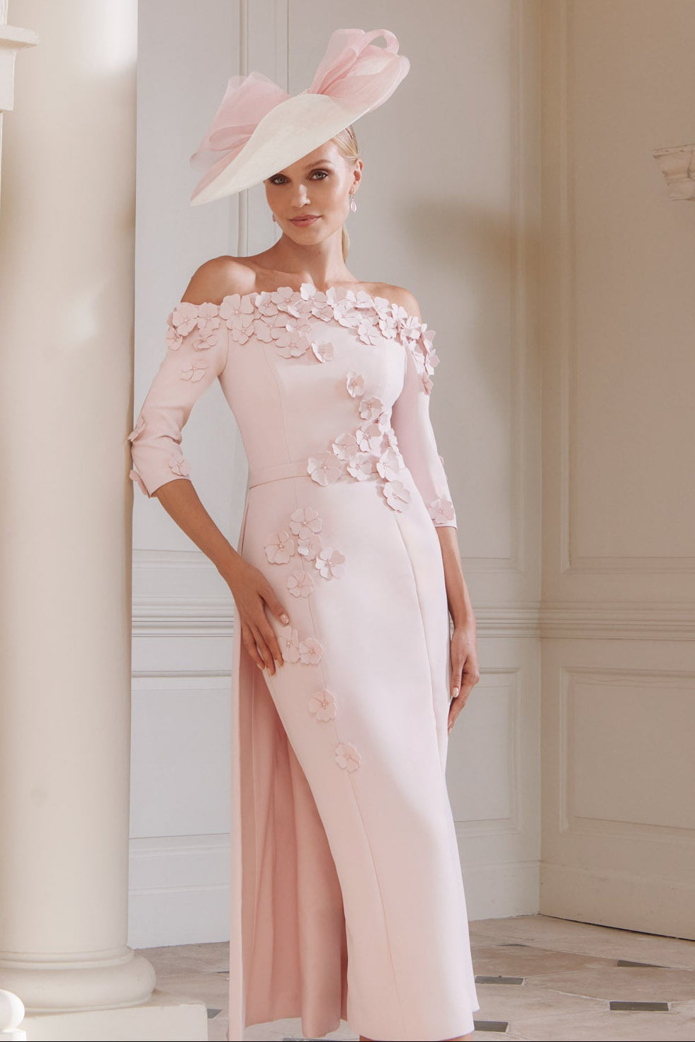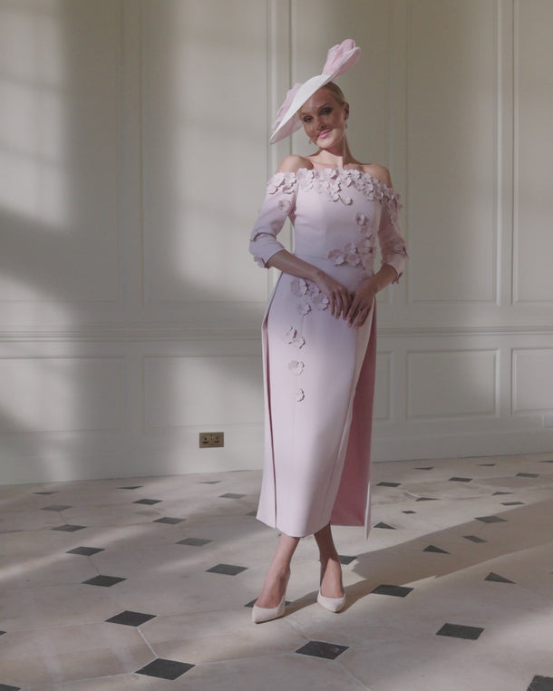 The John Charles 29318 Petal is an elegant midi dress designed for mothers of the bride or groom, and equally stunning as a bridal choice. This sophisticated piece features a fitted bodice with three-quarter sleeves and a gracefully draped caped skirt that adds movement and dimension. The delicate appliqué floral design brings refined detail and visual interest, creating a timeless silhouette that flatters and inspires confidence. Perfect for milestone celebrations, this dress combines classic tailoring with contemporary styling for an unforgettable occasion.