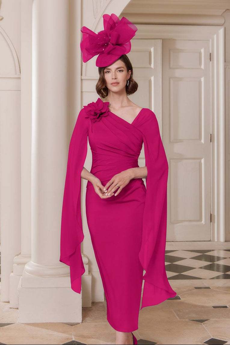 This John Charles 29344 dress in ruby pink combines delicate chiffon and smooth crepe for a refined straight midi silhouette. Designed with elegant chiffon sleeves, it offers a graceful and comfortable fit, ideal for mothers of the bride or groom seeking sophisticated style and timeless charm on the special day.