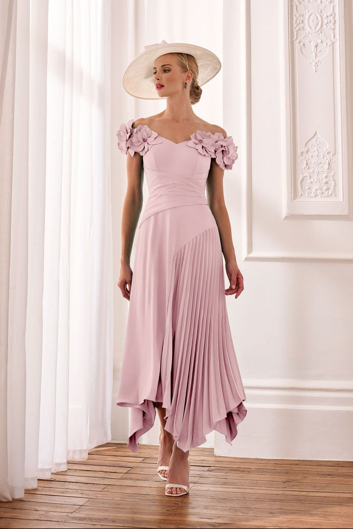 Indulge in timeless elegance with the John Charles 66632B Petal dress. Meticulously crafted with pleated cut work and 3D floral embellishments, this A-line crepe dress exudes sophistication. The graceful bardot neckline accentuates your shoulders, while the flowing silhouette flatters your figure. Perfect for formal occasions, it combines artistic flair with classic femininity for a radiant and refined look.