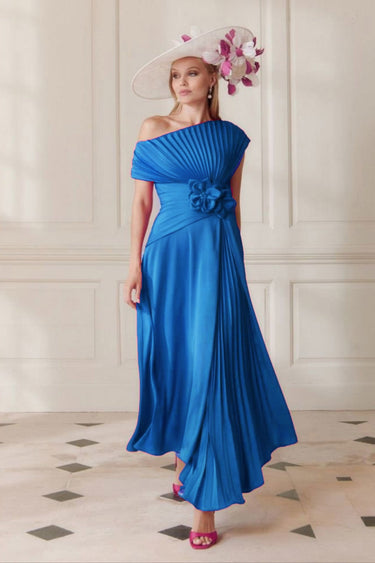 Elevate your elegance with the John Charles 66710 Sapphire midi dress. Crafted with luxurious crepe and delicate cut work, this asymmetrical a line dress boasts pleats for a flattering silhouette. Perfect for the mother of the bride or groom, feel confident and sophisticated on your special day.