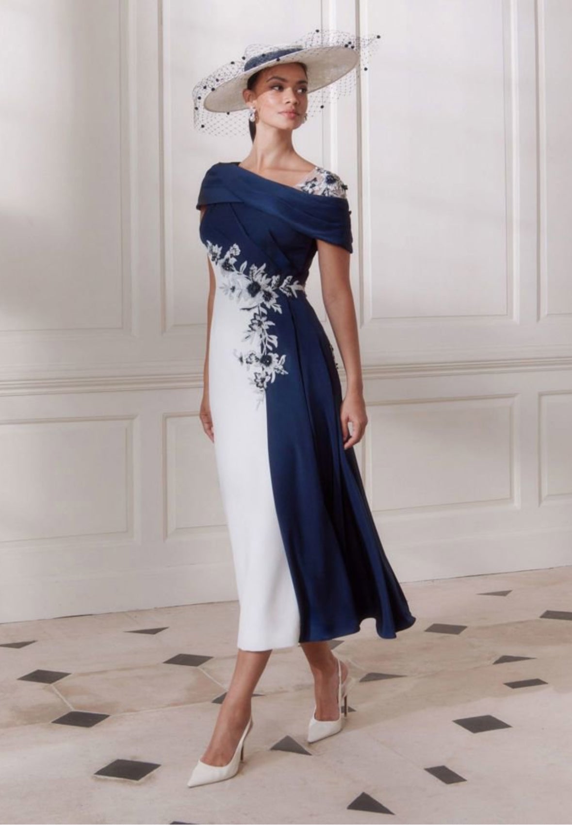 This John Charles 66716 Ivory / Navy straight midi dress is perfect for mothers of the bride or groom, or for any special occasion or event. Made of crepe with delicate appliqué, this dress exudes elegance and sophistication and is sure to make you look and feel your best.