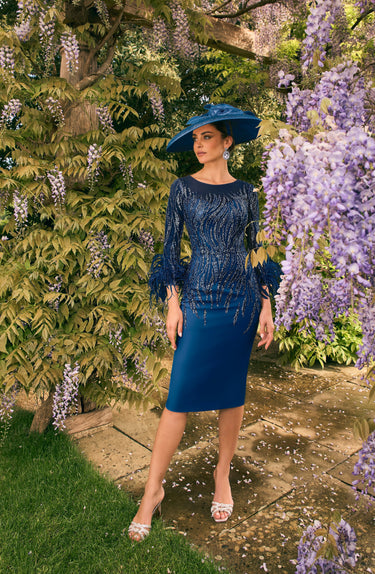This Veni Infantino 992707 Navy dress features a sophisticated knee-length silhouette crafted from crepe, enhanced with delicate beaded tulle and feather accents on the cuffs. Its fitted design and 3/4 length sleeves offer an elegant and refined look, perfect for a mother of the bride or groom attending a black-tie event. The combination of textures adds subtle luxury while maintaining classic style.