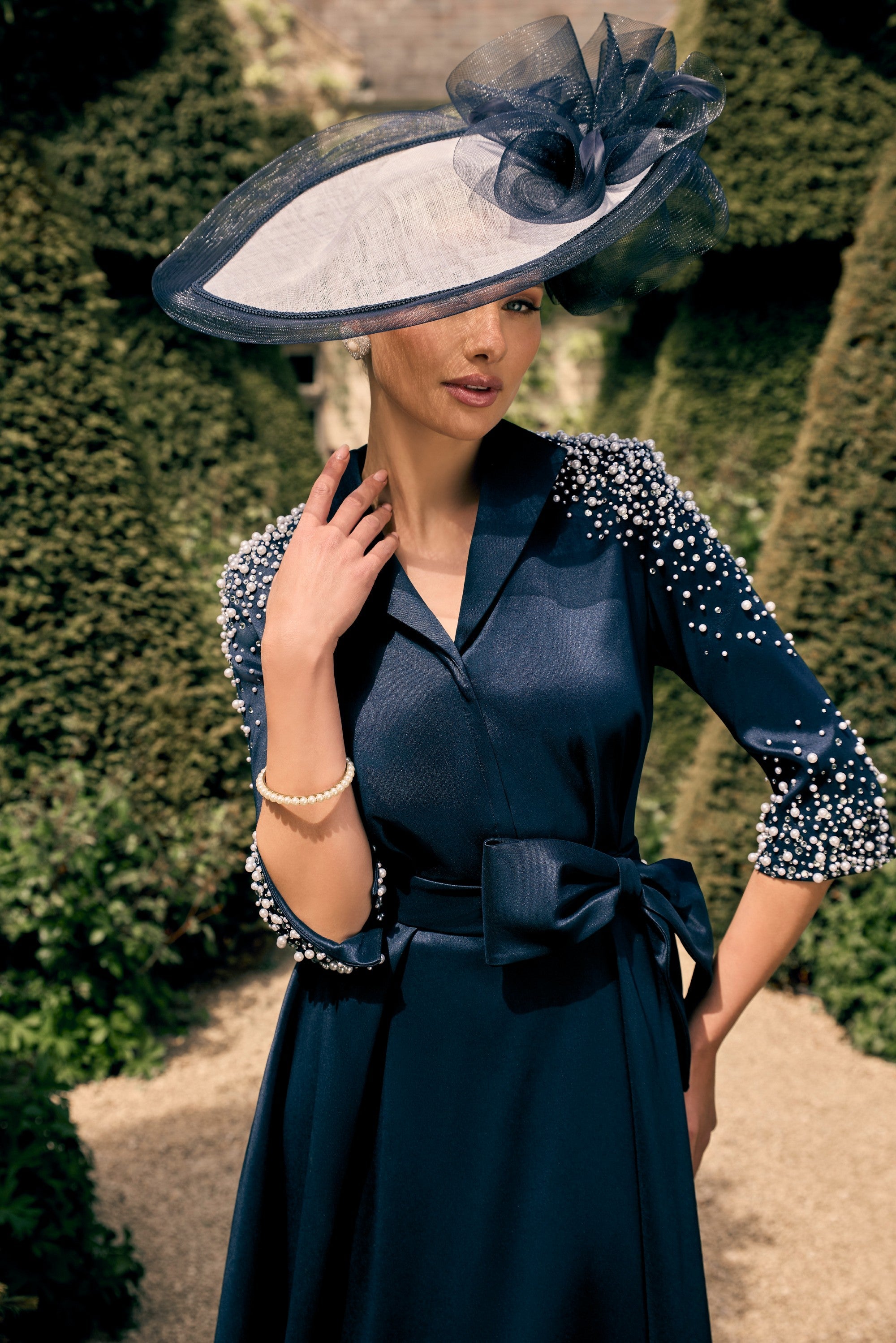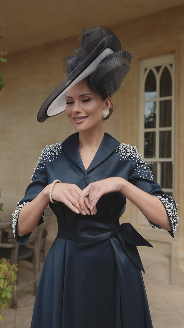 This elegant Veni Infantino dress in navy mikado features a flattering A-line midi skirt and sophisticated 3/4 sleeves. Accented with delicate ivory beaded trim, it offers a refined look perfect for the mother of the bride or groom, as well as for special occasions like events in the royal enclosure. Its classic silhouette combines timeless style with subtle decorative detail, ensuring a graceful and polished appearance.