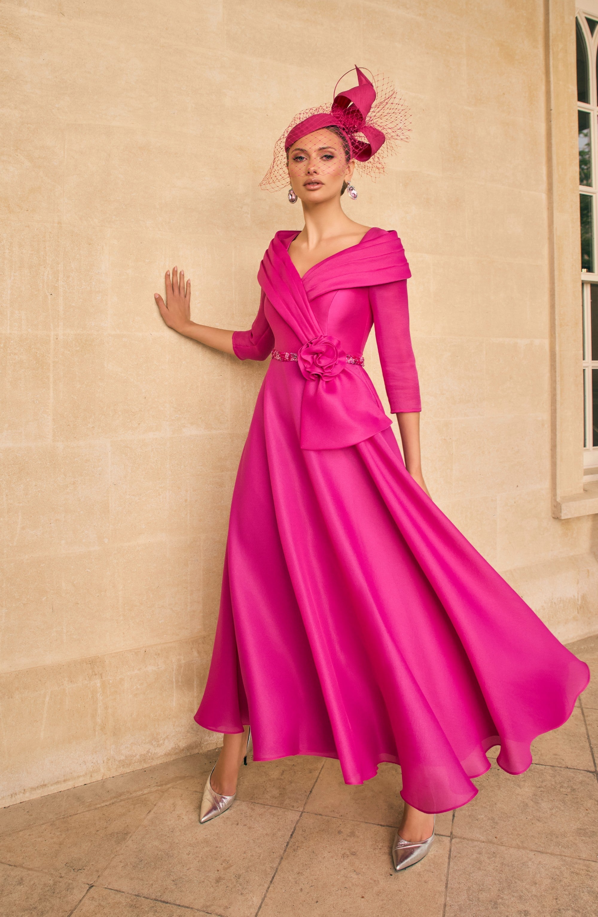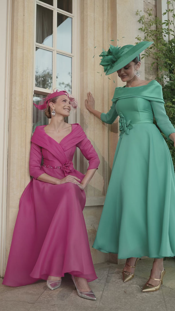 The Veni Infantino 992720A in Fuchsia is an elegant aline midi to maxi dress, expertly crafted in luxurious mikado organza. It features a delicate pleated collar and refined 3/4 sleeves, accented with intricate beaded trim for a sophisticated finish. Ideal for the mother of the bride or groom, this dress balances classic style with modern details, ensuring a graceful and memorable look for any formal occasion.