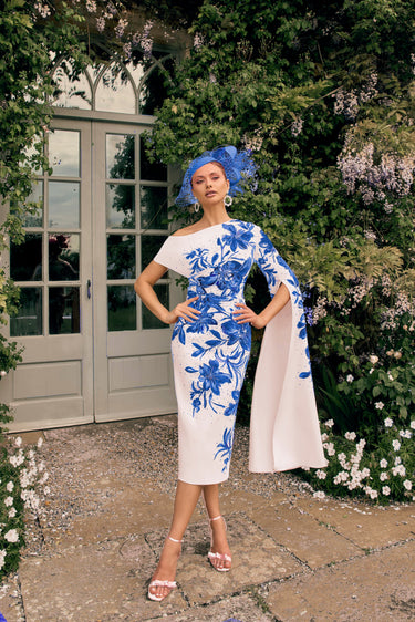 This Veni Infantino dress in pale blue and royal tones features a crepe fabric with a striking print and an asymmetric, fitted silhouette that falls gracefully below the knee. Designed specifically for the mother of the bride or groom, it combines elegance with a modern edge, ensuring a flattering and sophisticated look for your special occasion.