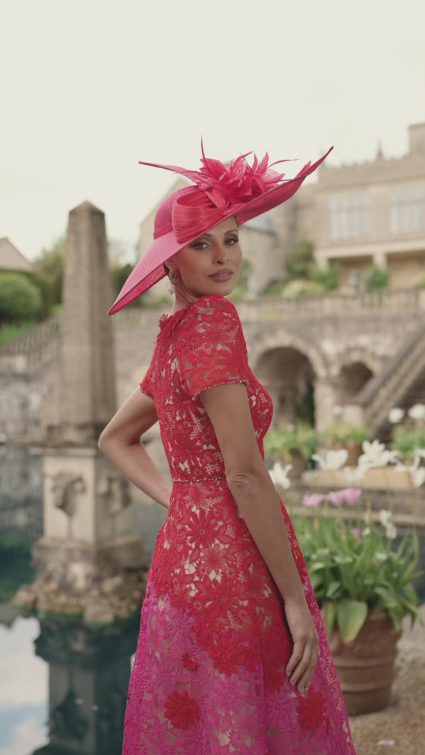 This Veni Infantino 9927400 dress features a striking red and fuchsia lace and tulle design, combining elegance with modern flair. The midi to maxi A-line silhouette gently flatters the figure, while short sleeves provide comfortable coverage. Ideal for mothers of the bride or groom and perfect for race day events, this dress balances sophistication and eye-catching detail for memorable occasions.