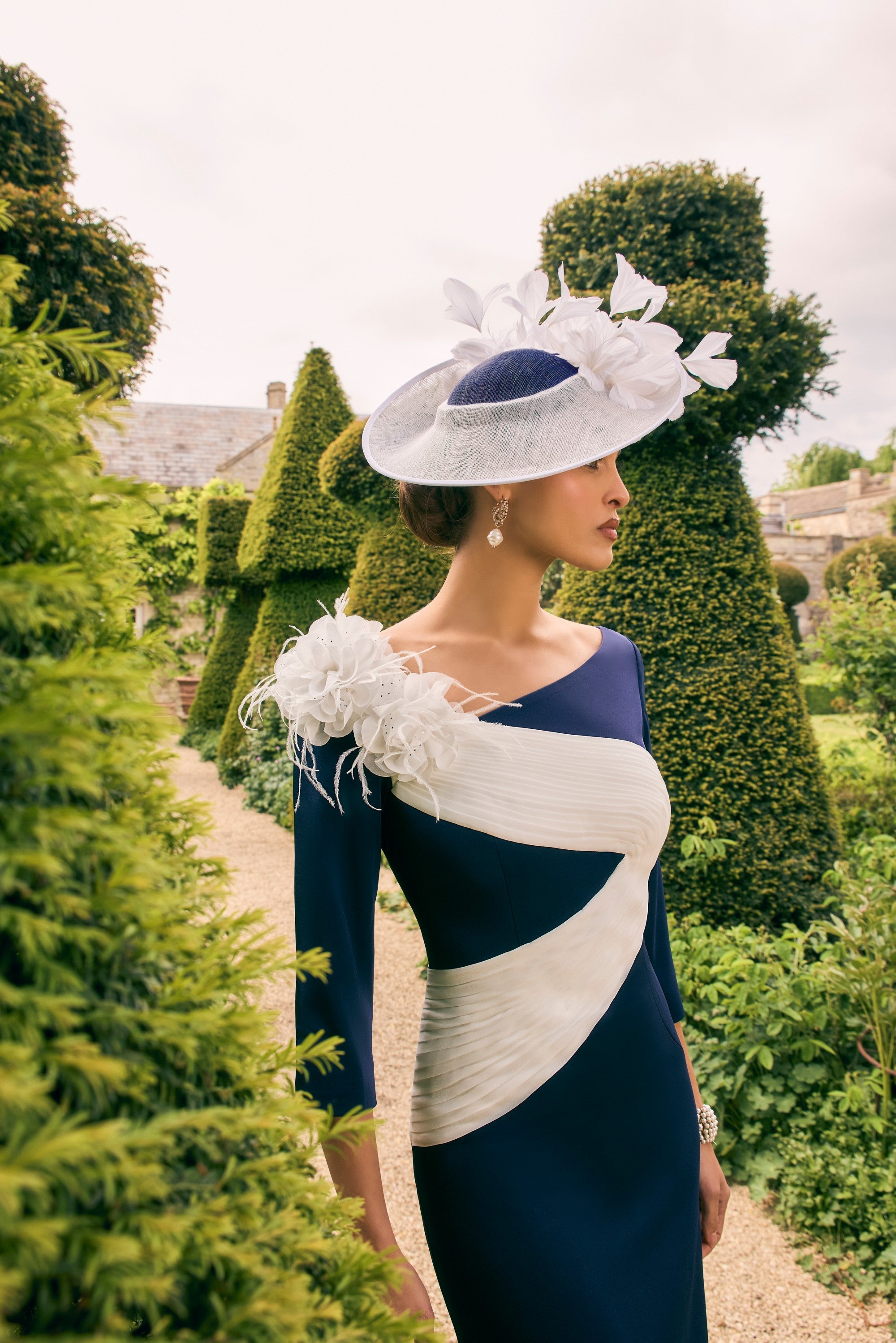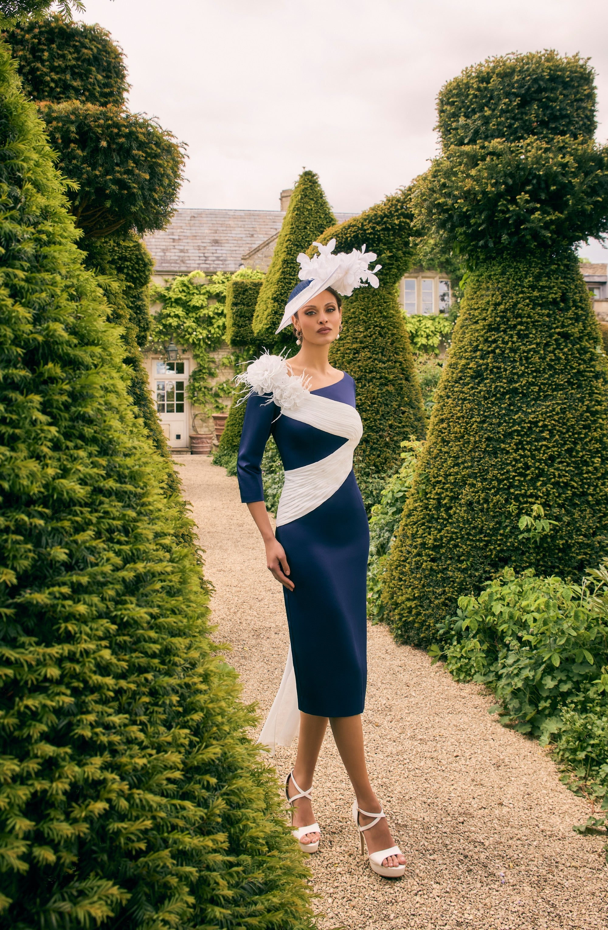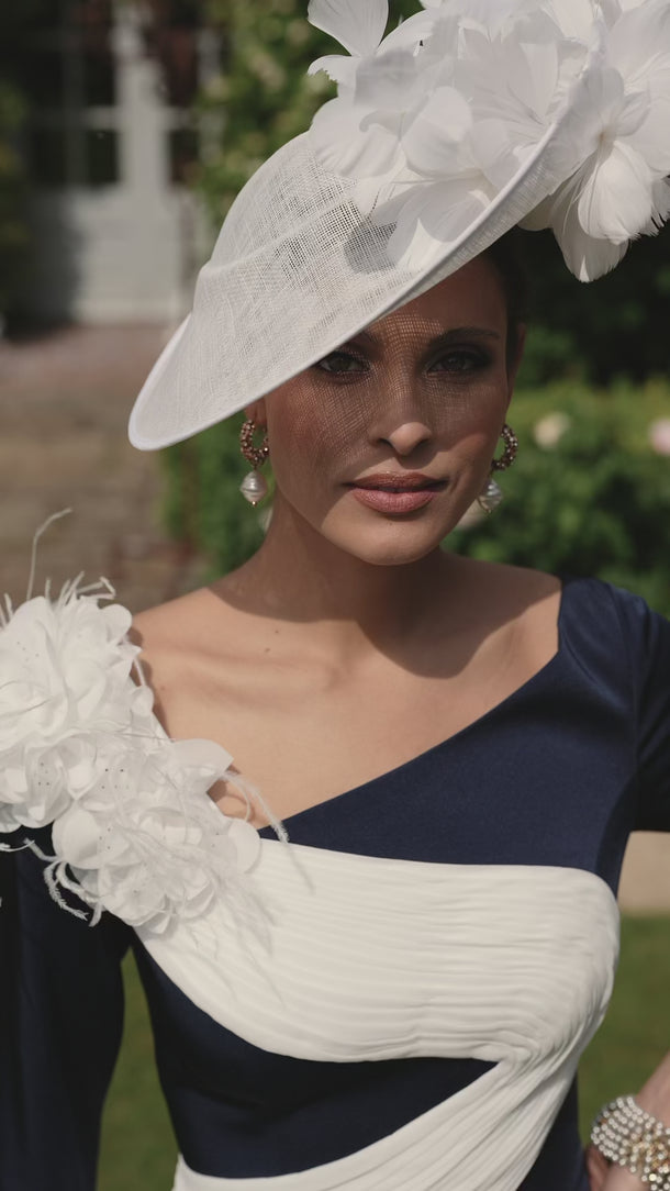This Veni Infantino 992758 dress combines navy crepe with delicate ivory chiffon in a knee-length fitted design. Featuring elegant 3/4 sleeves and a refined corsage detail, it offers a sophisticated silhouette ideal for mothers of the bride or groom seeking timeless style and subtle refinement.
