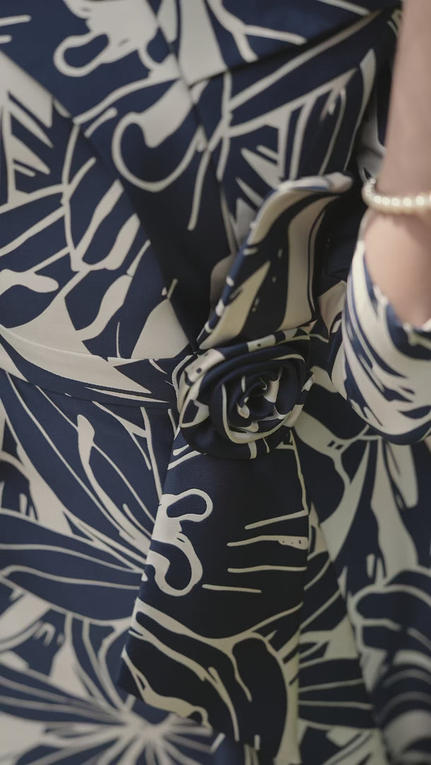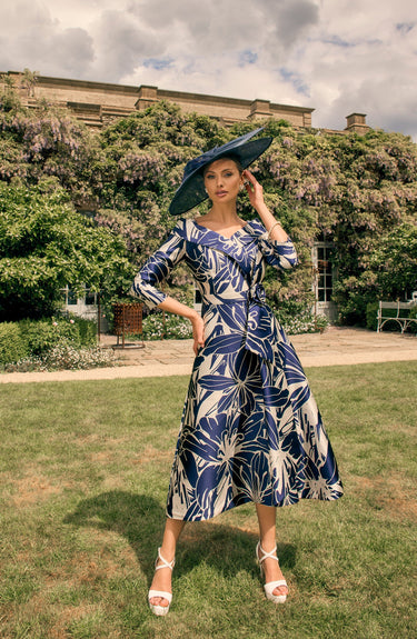 This Veni Infantino 992761 midi dress features navy and champagne mikado print, expertly tailored in an elegant A-line silhouette. Designed with flattering 3/4 sleeves, it offers a refined choice for mothers of the bride or groom seeking sophistication and comfort. The structured mikado fabric ensures a polished finish, making it perfect for formal occasions.