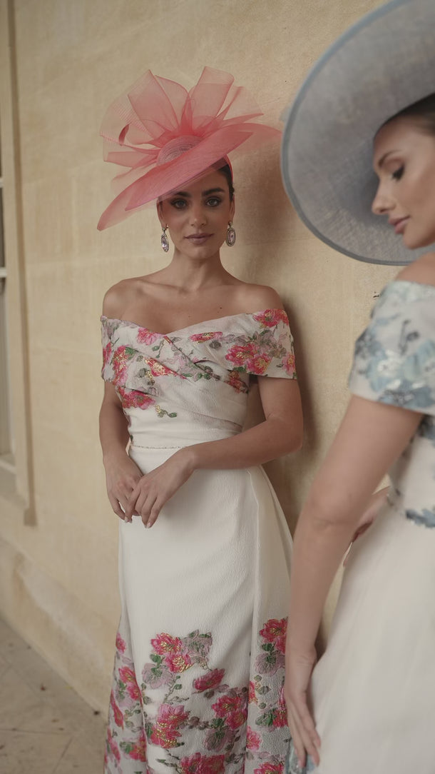 This Veni Infantino 992768 dress combines elegance and sophistication with its ivory and coral textured organza fabric. Designed as an off-shoulder, A-line silhouette that falls gracefully to the ankle, it features a striking bow at the back, adding a refined touch. Ideal for mothers of the bride or groom, this dress offers a timeless look with delicate detailing that enhances its formal appeal.