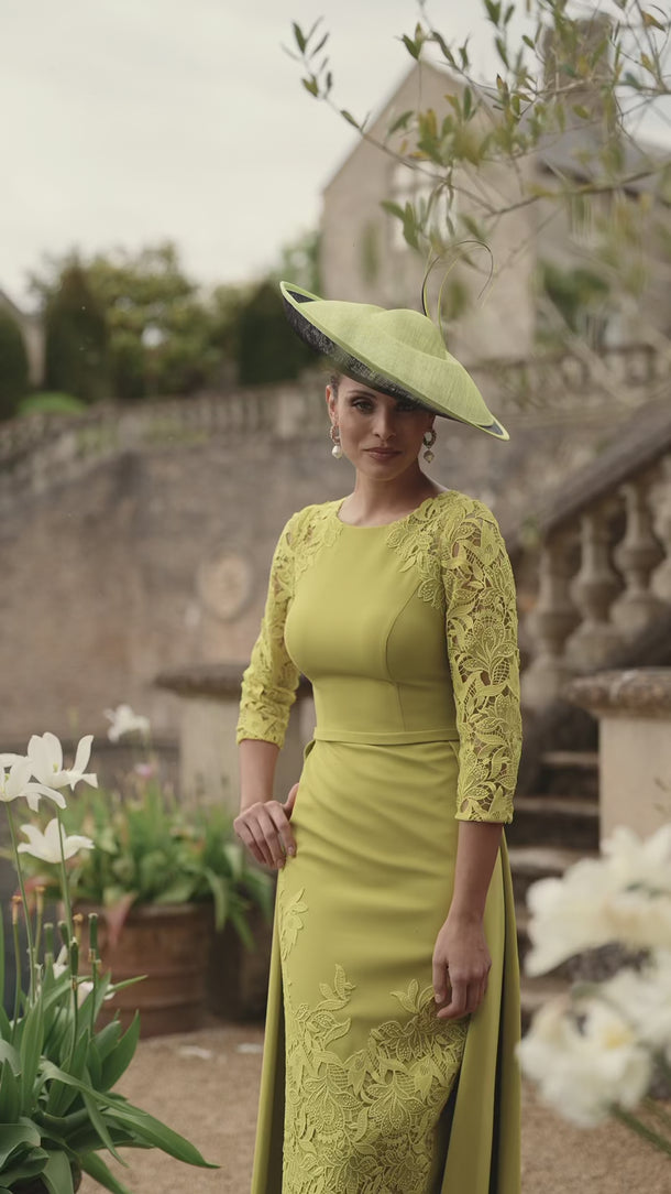 This elegant Veni Infantino 992772 dress features a sophisticated lime hue with a fitted midi silhouette. Designed with a high round neckline and three-quarter sleeves, it combines classic crepe fabric with a delicate lace, a caped skirt, offering timeless style and refined texture. Ideal for mothers of the bride or groom, this dress balances formal elegance with modern details for a graceful and polished appearance.