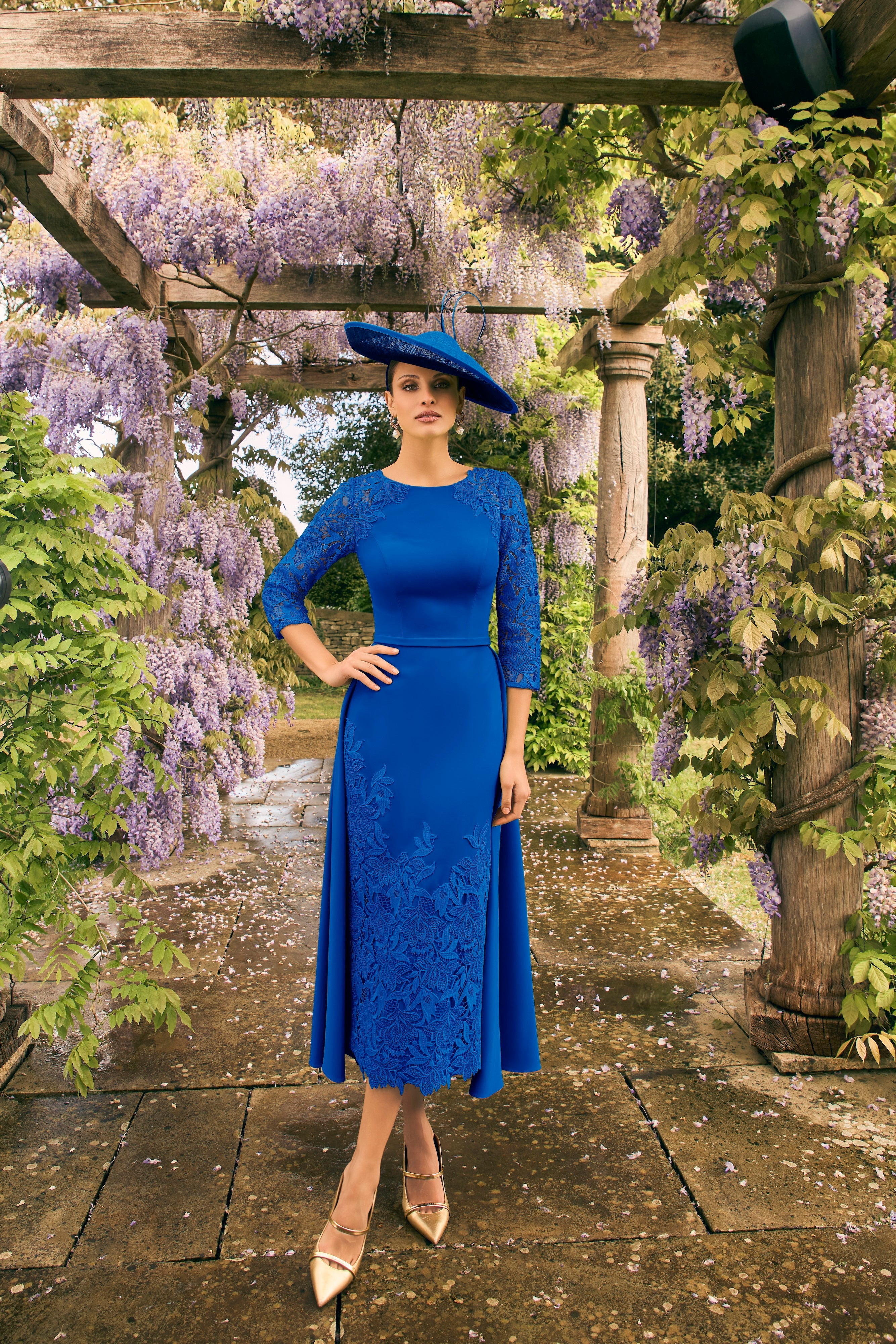 This elegant Veni Infantino 992772 dress features a sophisticated royal blue hue with a fitted midi silhouette. Designed with a high round neckline and three-quarter sleeves, it combines classic crepe fabric with a delicate lace, a caped skirt, offering timeless style and refined texture. Ideal for mothers of the bride or groom, this dress balances formal elegance with modern details for a graceful and polished appearance.