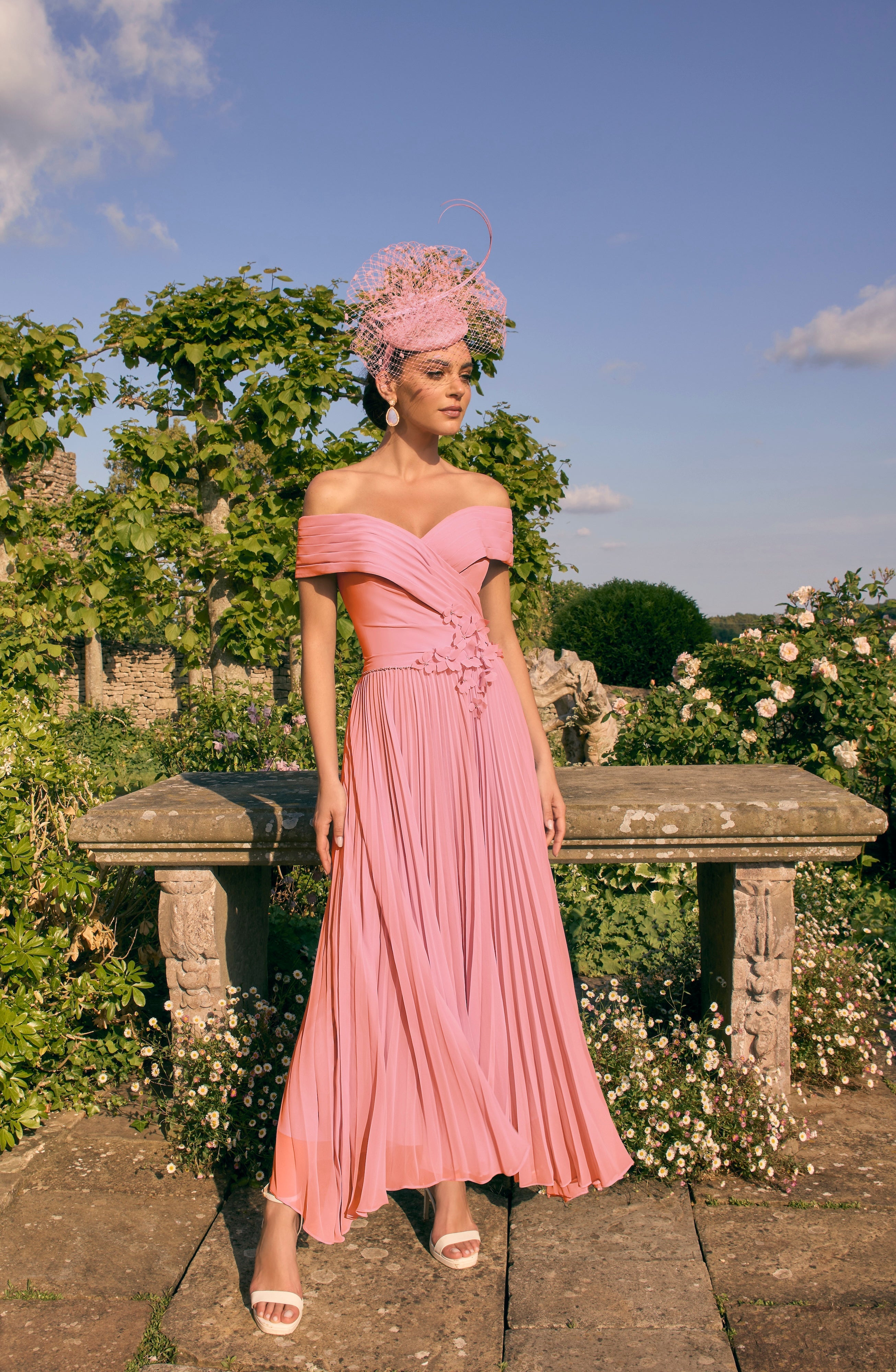 Elevate your special occasion look with the Veni Infantino 992779 in Coral. This maxi A-line dress features an off-shoulder neckline adorned with delicate applique flowers at the waist, adding refined elegance. The plain chiffon fabric flows beautifully, while the pleated skirt enhances movement and grace. Perfectly suited for mothers of the bride or groom seeking a sophisticated and timeless style.