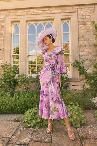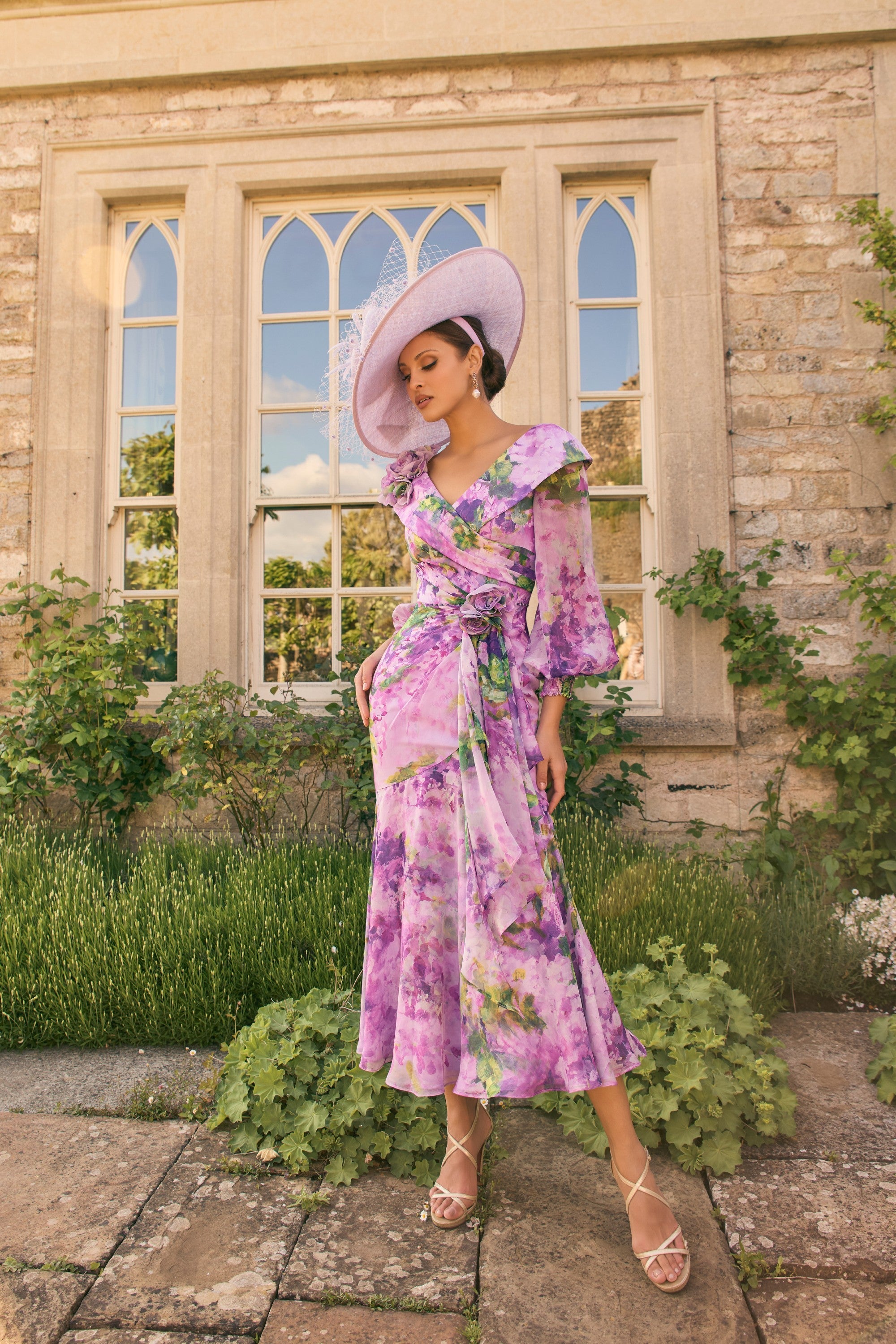 The Veni Infantino 992782 dress combines elegance and modern style with its vibrant pink and green chiffon print. Designed with a flattering faux wrap effect, it features balloon sleeves and corsage detailing at the shoulder and waist, enhancing its fitted and flared silhouette. Perfect for mother of the bride or groom at destination weddings and summer events, this midi to maxi dress offers both comfort and sophistication in one striking look.