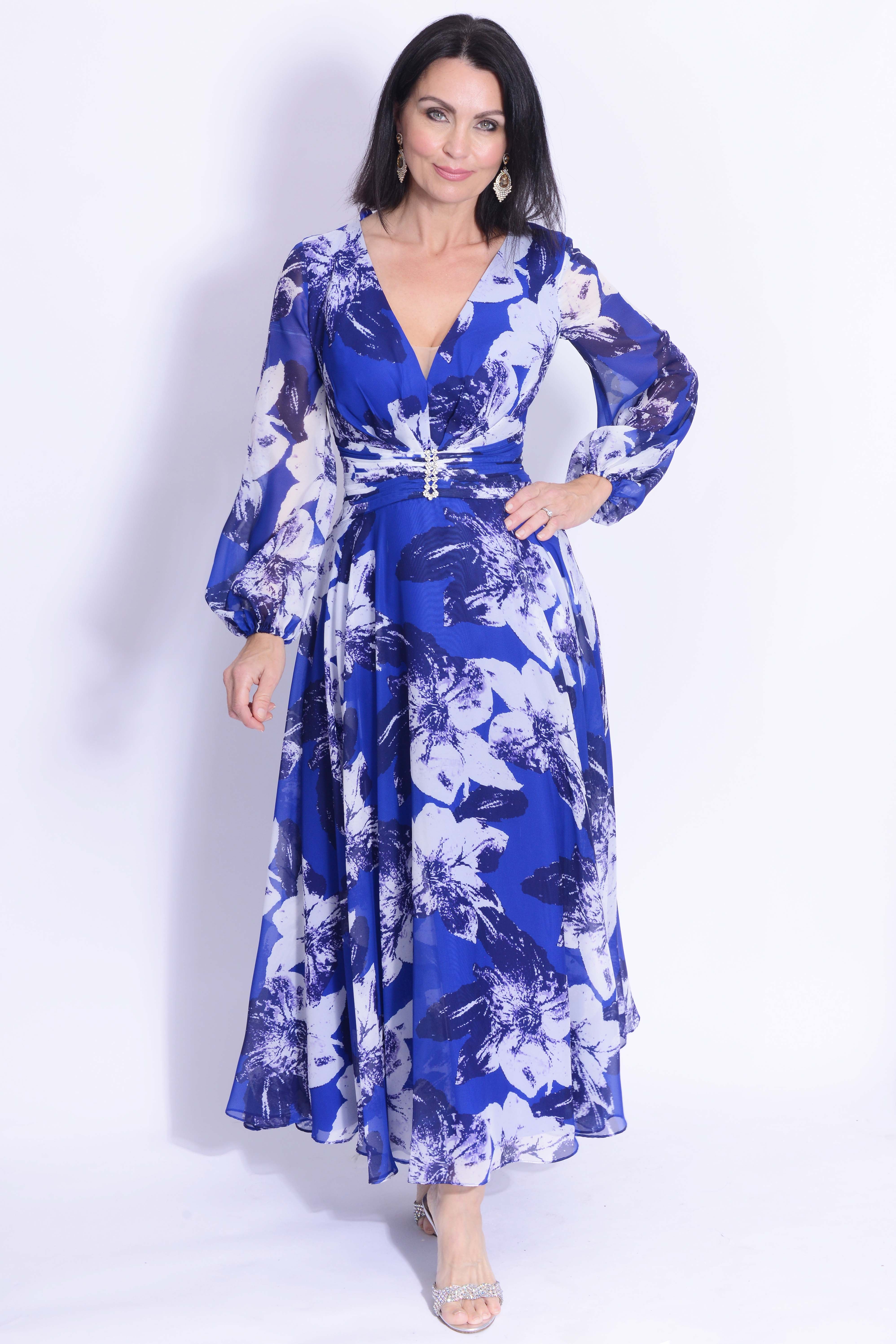 Effortlessly elegant, the Couture Club 7G130 Cobalt dress is a must-have for any mother of the bride or groom. Crafted from luxurious chiffon with a sophisticated print, this dress is perfect for any special occasion. Its long sleeves provide both style and comfort, making it a timeless addition to your wardrobe.