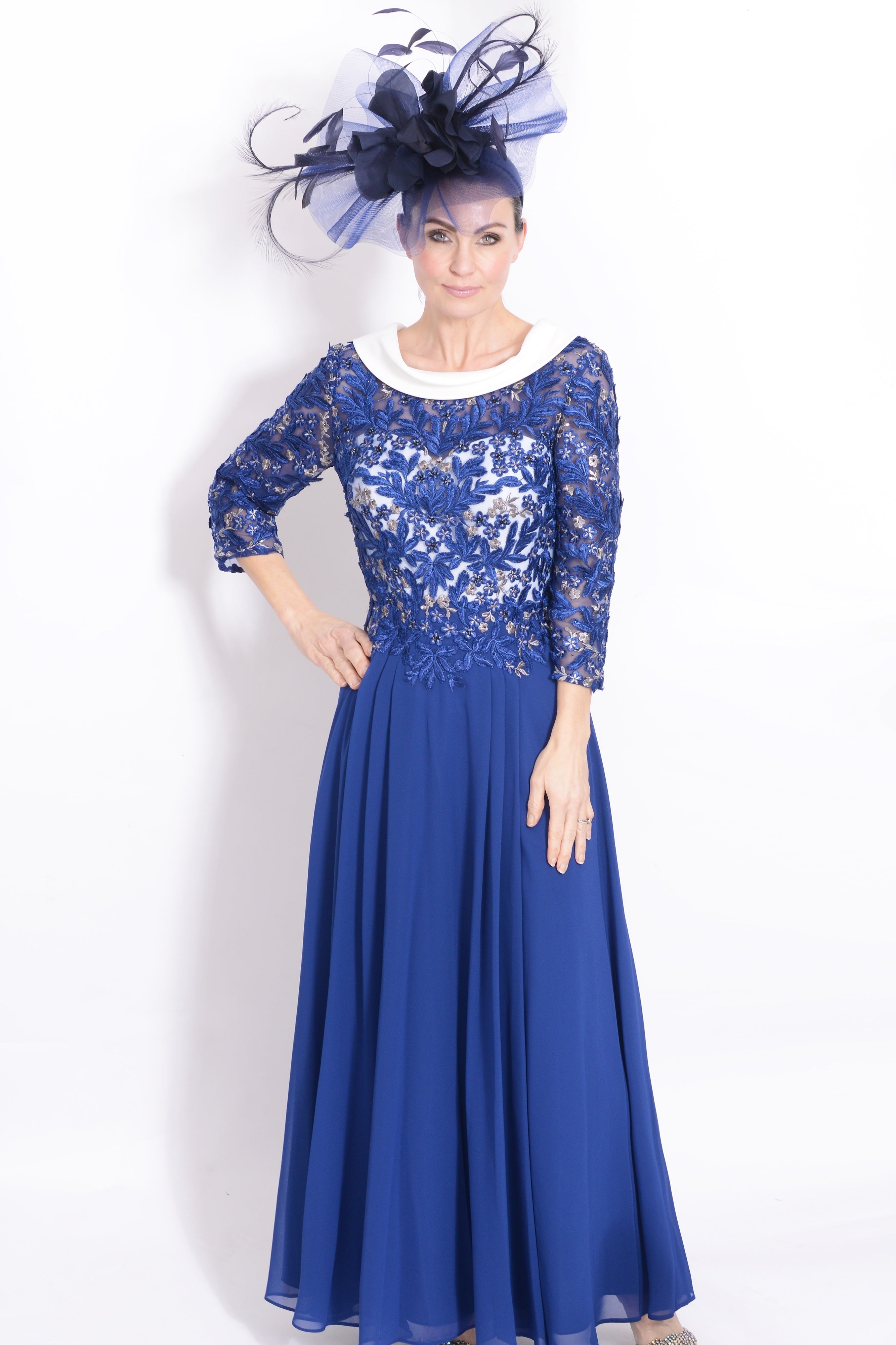 Introducing the Couture Club 7G1A8 Navy dress, the epitome of elegance and versatility. Elevate your wardrobe with this stunning chiffon dress featuring a delicate lace bodice. Ideal for any occasion, its navy hue exudes sophistication. Make a statement and stand out from the crowd with this exclusive piece from the Couture Club. Perfect for the mother of the bride or groom.