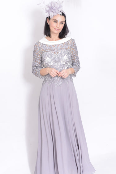 Indulge in luxury with Couture Club's 7G1A8 Silver dress. This exquisite chiffon dress features a longer length for added elegance, while the delicate lace top bodice adds a touch of femininity. Perfect for mothers of the bride and groom, elevate your wardrobe with this exclusive piece.