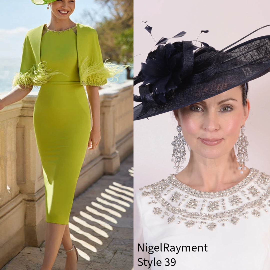 Indulge in luxury with the Couture Club 9G62 Pistachio dress. This fitted midi dress boasts an attached cape adorned with elegant feather detailing, making it a show-stopping piece. Perfect for special occasions, this dress is a true representation of couture fashion. Ideal for mothers of the bride or groom.