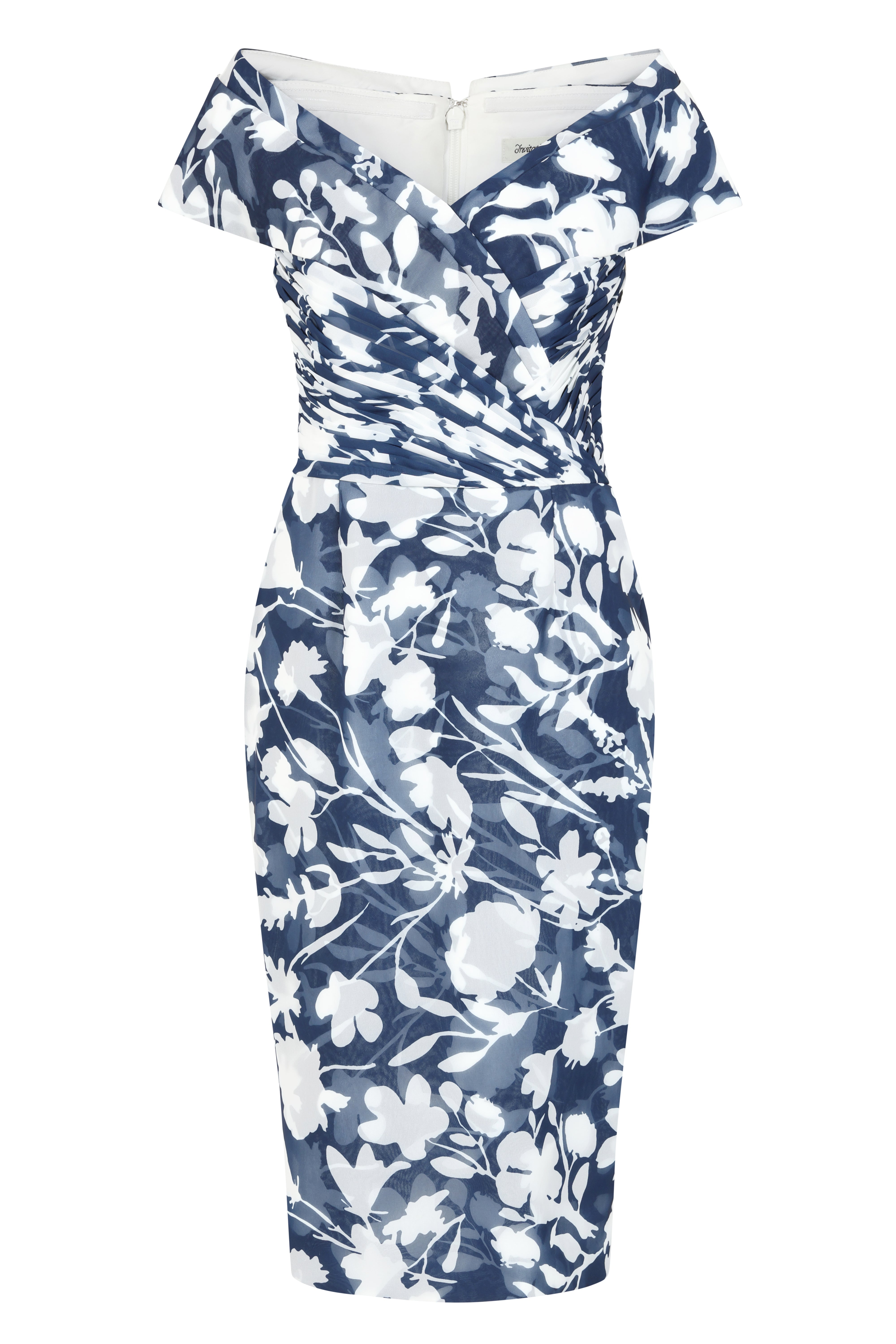 Introducing Invitations by Veni 36008A Navy/Ivory, the perfect choice for any formal event. This fitted knee length dress features a flattering off shoulder neckline, adding a touch of elegance to your outfit. Make a statement and stand out with Veni's stylish design.