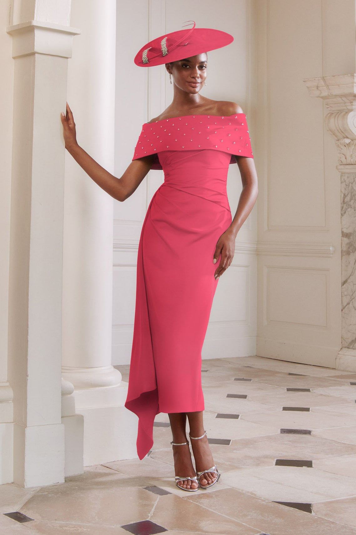 John Charles 29307 Persian Rose Fitted Off-Shoulder Midi Dress Elegance meets occasion wear with this John Charles design, expertly crafted for mothers of the bride or groom. The fitted silhouette flatters the figure whilst the off-shoulder neckline adds contemporary sophistication. Cut to midi length, this dress strikes the perfect balance between refined and fashion-forward, making it an ideal choice for destination weddings and formal celebrations. The structured fit ensures all-day comfort, whilst the timeless design transcends seasonal trends.