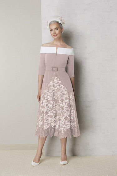 The John Charles 66101 Dress is an elegant off-the-shoulder design featuring a delicate lace overlay skirt that adds texture and sophistication. The contrasting collar creates a striking focal point, while the soft ivory hue beneath the lace ensures a graceful and refined look. This dress beautifully balances classic charm with contemporary detail, making it the perfect choice for the mother of the bride or any formal occasion where you want to make a confident and memorable impression.