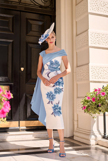 The John Charles 66602 Blue Rose Dress is a statement midi crepe gown featuring a fitted silhouette that exudes modern elegance. Bold floral embroidery and striking asymmetric contrast sleeves add a unique, contemporary twist to classic tailoring. Perfect for the mother of the bride or any formal event, this dress ensures you stand out with sophistication and style.