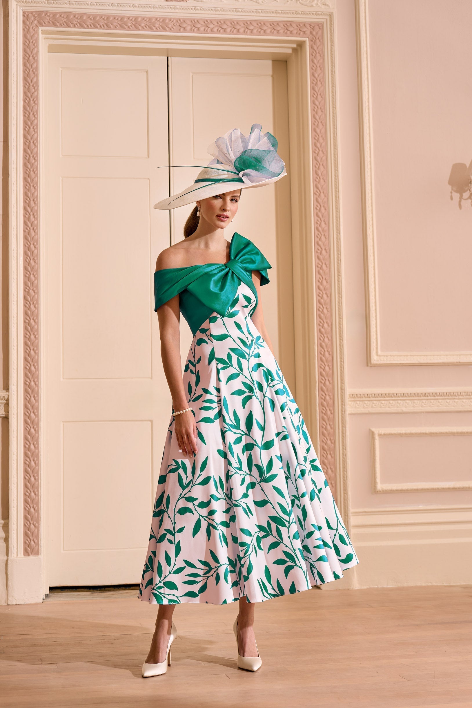 The John Charles 66604 Green Dress features a fit and flare silhouette crafted from printed mikado fabric, designed to flatter and captivate. Its asymmetric off-the-shoulder neckline adds a modern edge, while the bold contrast bow provides a striking focal point. Perfect for the mother of the bride or any formal occasion, this dress blends classic elegance with contemporary style to ensure you leave a lasting impression with grace and confidence.