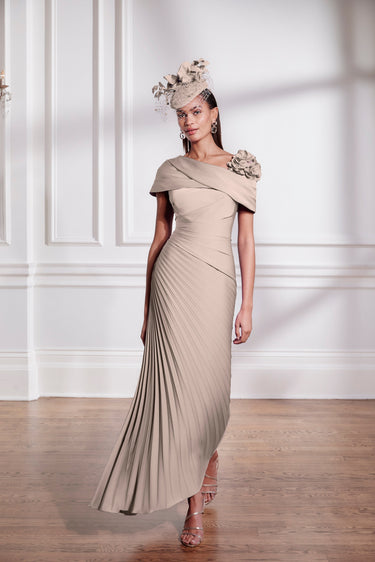 The John Charles 66703 Oyster Dress blends refined crepe fabric with a plissé midi skirt and a carefully pleated waist to create a beautifully flattering silhouette. Highlighted by an asymmetric neckline and delicate 3D floral accents on the shoulder, this dress exudes sophistication and modern elegance. Perfect for the mother of the bride or groom, it offers a timeless yet contemporary look that ensures you make a graceful statement at any distinguished occasion.