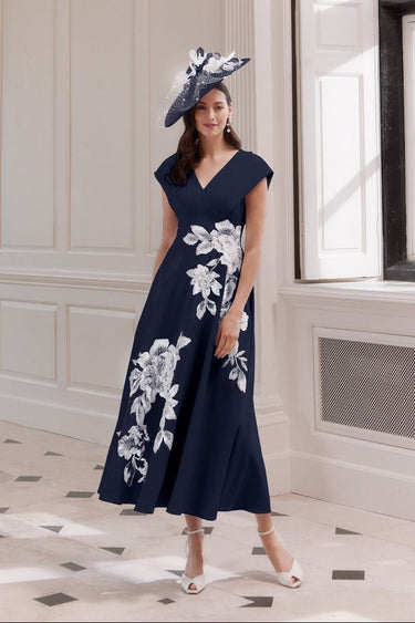 This John Charles 66718 Navy / Ivory dress is a stunning choice for the mother of the bride or groom. The v-neck and a-line silhouette flatter any figure, while the elegant crepe and delicate appliqué add a touch of sophistication. Perfect for a formal or semi-formal event.