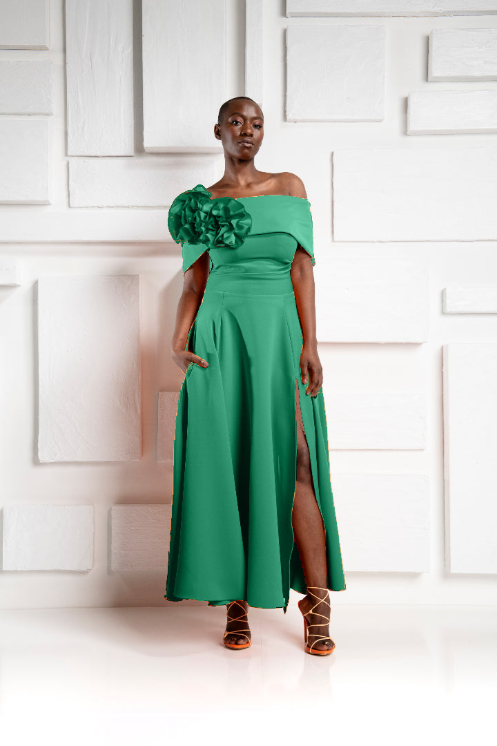 Unleash your inner goddess with the Kevan Jon - Kyoto Flare dress. The off-shoulder neckline and 3D rose detail exude elegance and decadence. With a side split for added allure, this dress will leave a lasting impression at any event.