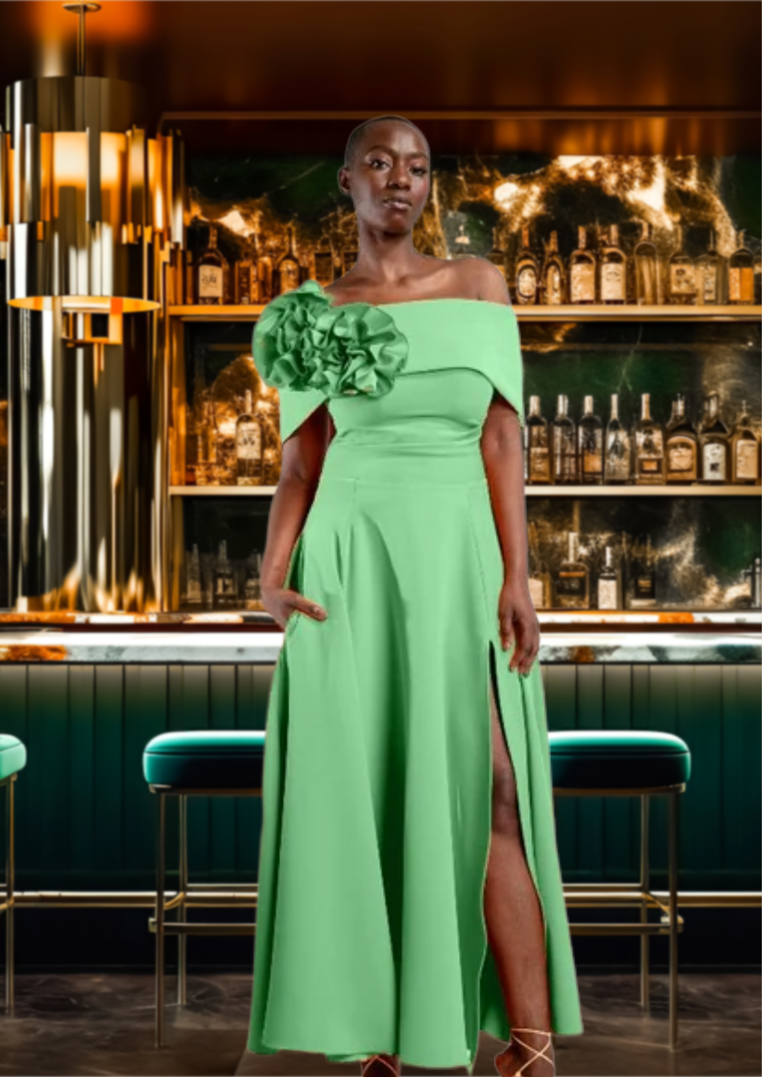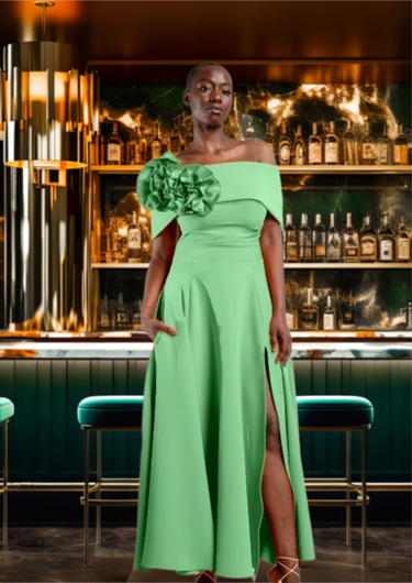 Introducing Kevan Jon's Kyoto Flare, a stunning flared dress in luxurious pistachio. The off-shoulder neckline adds a touch of elegance, while the statement rose detail elevates the overall look. Perfect for making a sophisticated statement at any event.