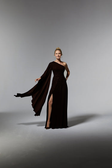 Feel effortlessly elegant in the MGNY Collection by Mori Lee 72904 black dress. This one-shoulder dress features an exaggerated sleeve and a front split to give you a flattering silhouette. Perfect for any special occasion.